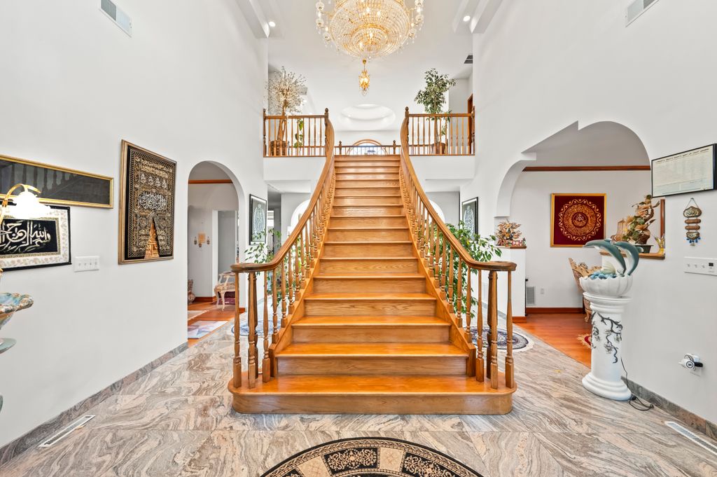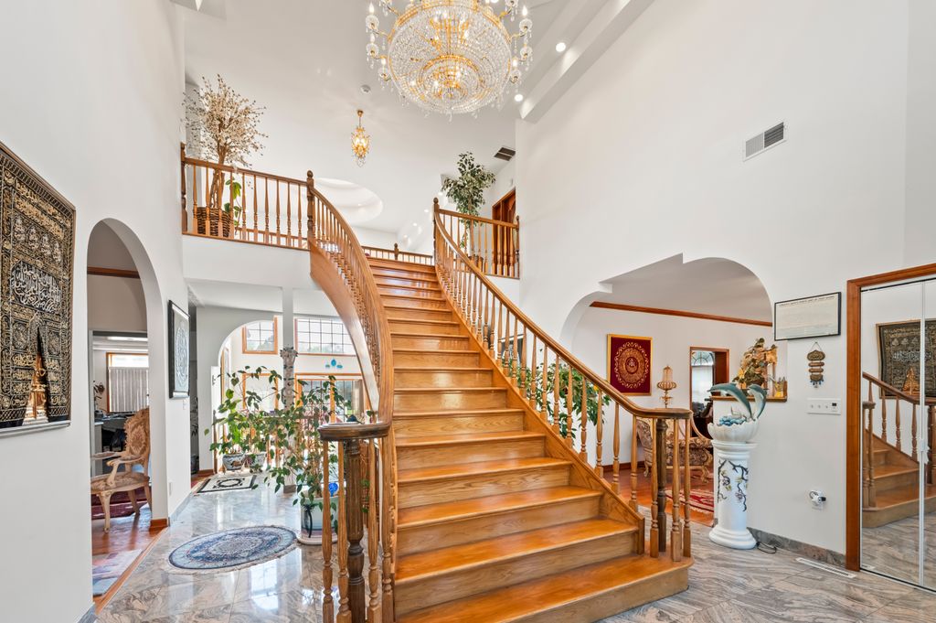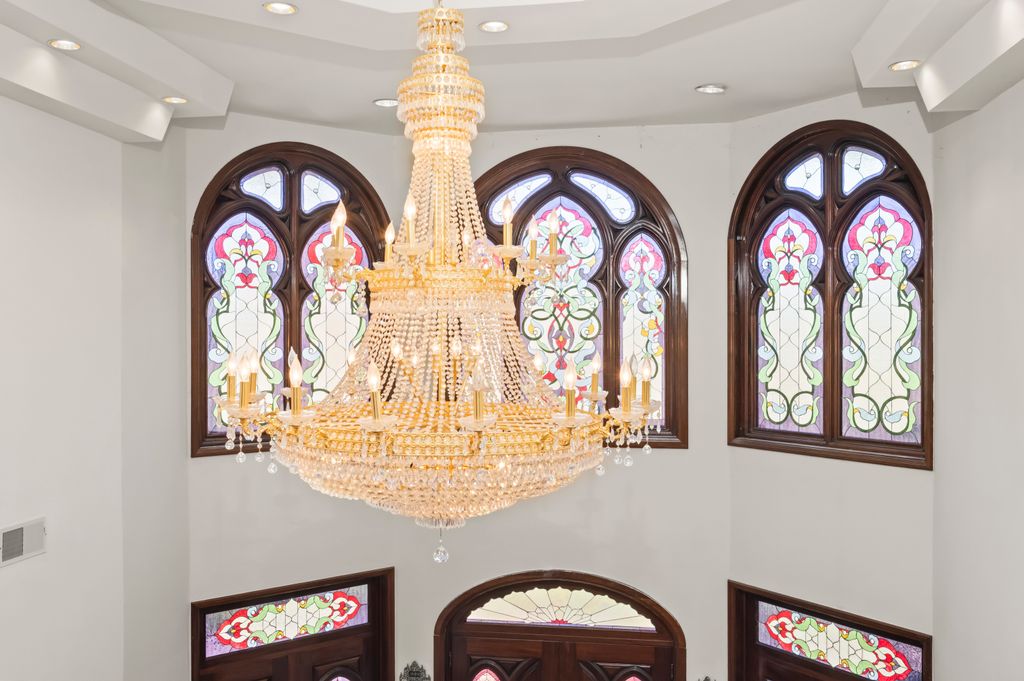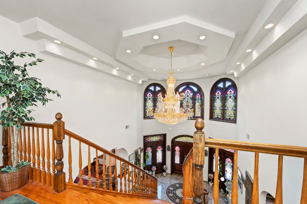The double door entry into the home is paired with a grand two level staircase as well as a gorgeous custom stained glass windows that let in an abundance of light.