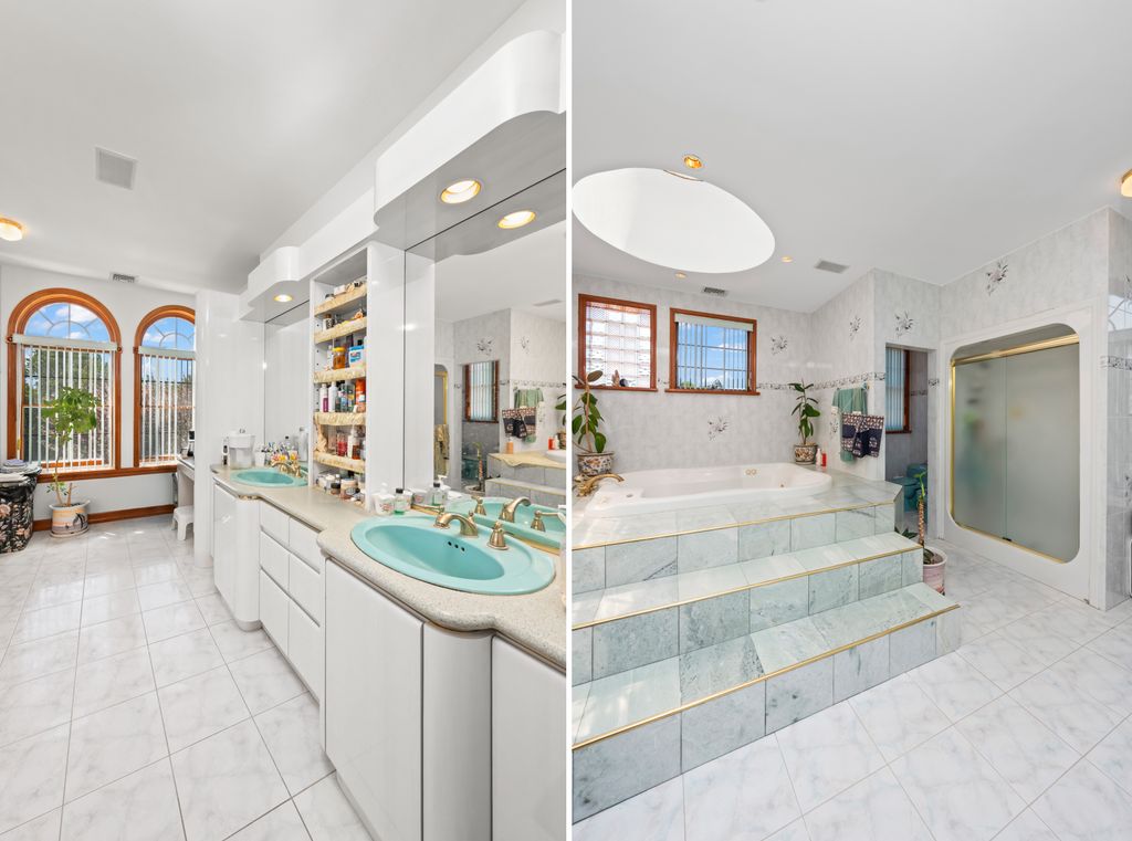 The 1st floor of the home has an ideal layout perfect for entertaining many guests as there is a formal living room & formal dining room, a two story conversation room that provides deck access, a great room as well as an eat-in kitchen with a full array of appliances inclusive of a custom cladded Sub-Zero Refrigerator, compactor, dishwasher, double wall oven, cook top, garbage disposal center island, endless cabinet space as well as a breakfast area overlooking the yard.